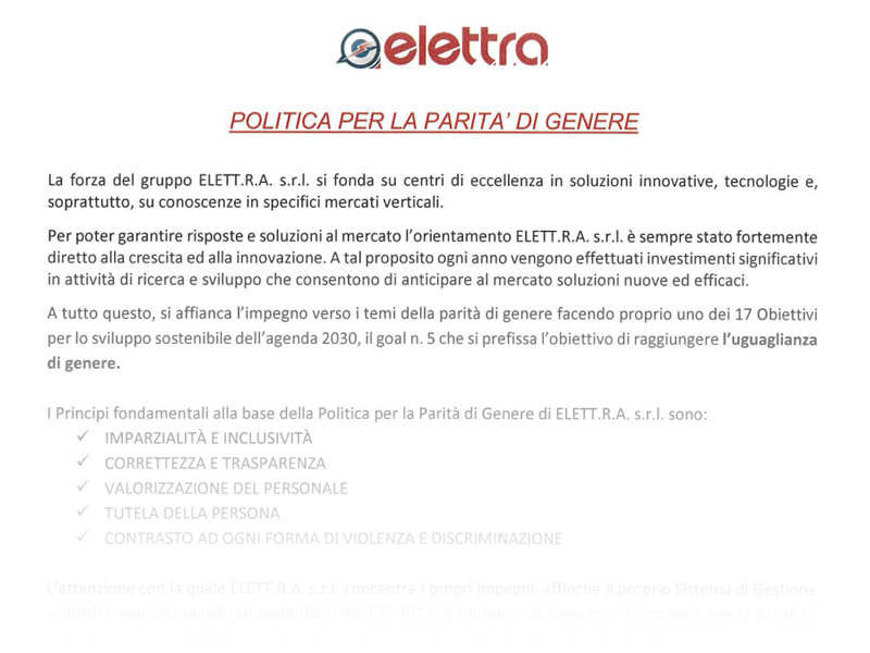 ELETT.R.A. S.r.l. ha implementato un sistema di gestione per la parità di genere conforme alla prassi di riferimento UNI/PdR 125:2022, in linea con gli obiettivi strategici dell'Unione Europea e dell'Agenda 2030.